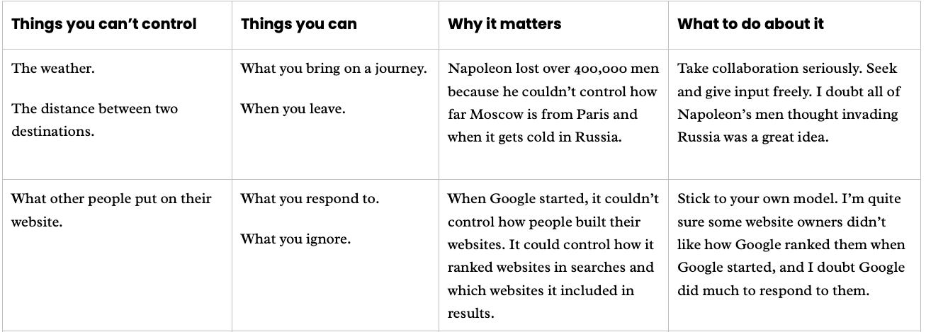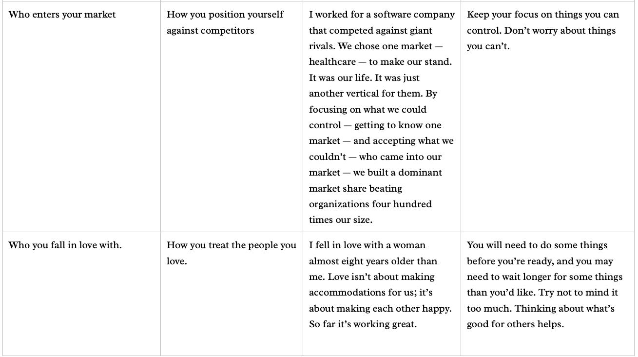 Here’s my Chapter in a Chart for Chapter 1: Identify what you can and can’t control.