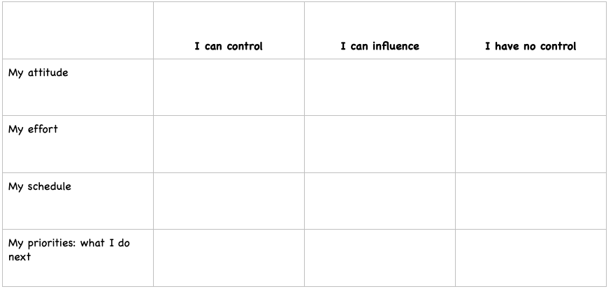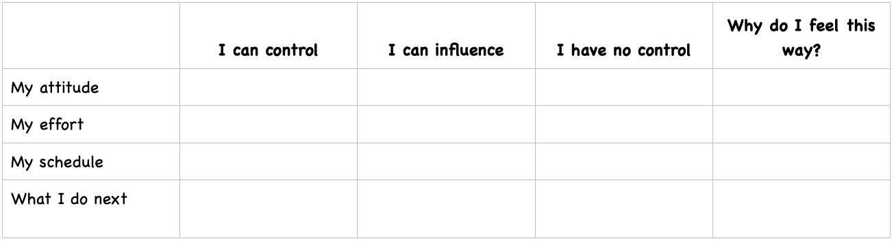 “Look at the list below and decide how you think of each item. Do you have control of it, can you influence it, or do you have no control? Put a √ in the column that describes how you feel about attitude, effort, schedule, and what you do next.”